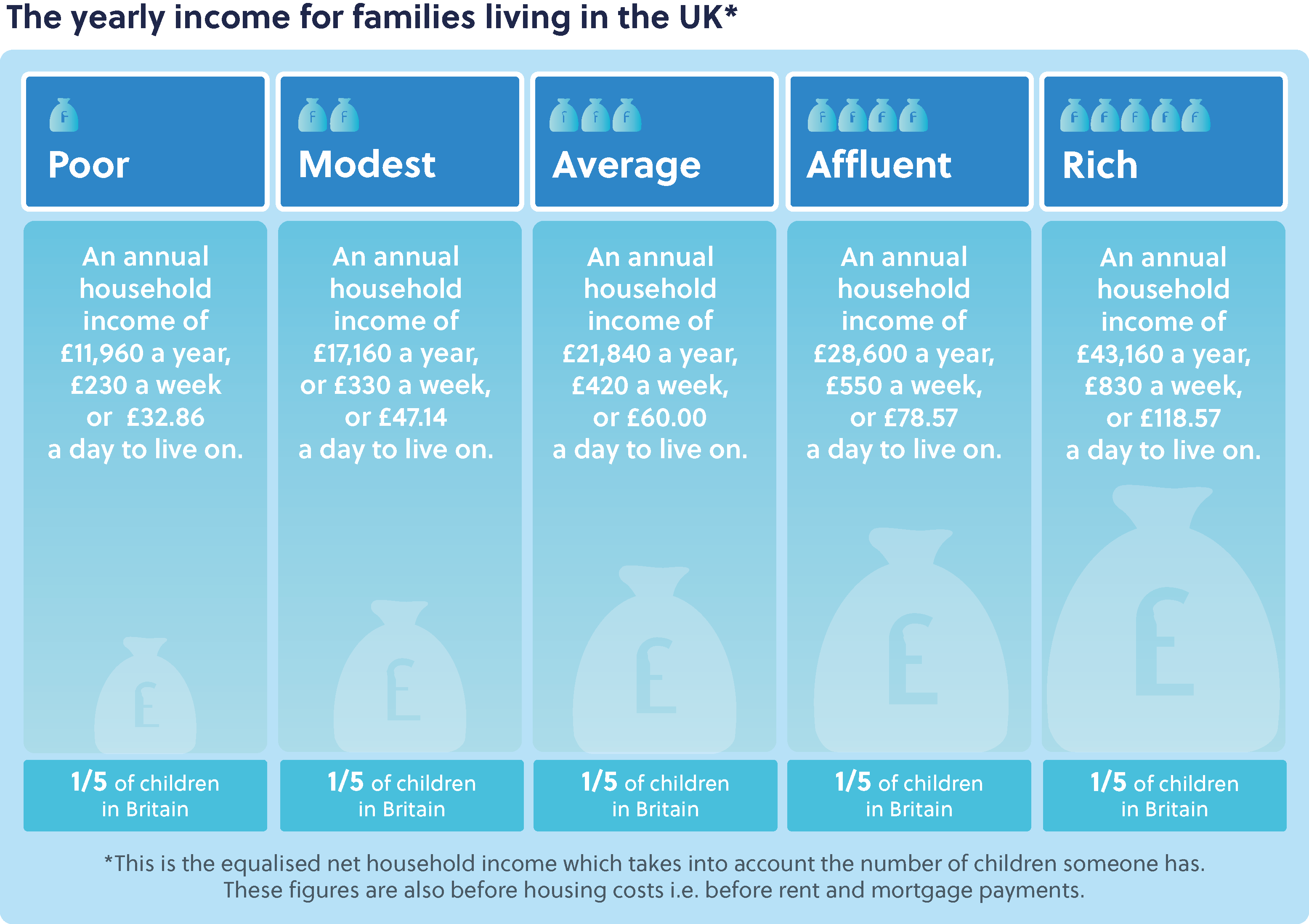 The series of graphics below show the reality for families living in the UK and how the population can be broadly said to be made up of five economic groups: